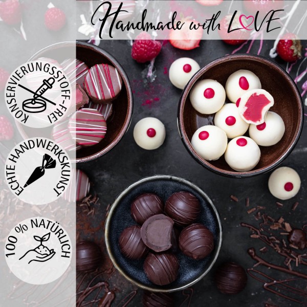 • Jede Praline ist ein von Meisterhand gefertigtes Unikat, handgeschöpft mit Liebe kreiert