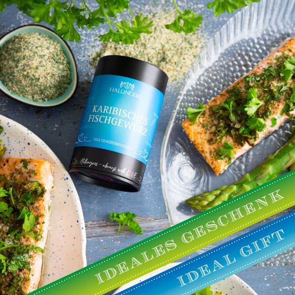 Gewürze Geschenk - Gewürz-Mischung für Fisch, Gemüsepfanne & Avocado, edle Geschenkdose "Karibisches Fischgewürz", Geschenkidee für Hobbyköche & Grillfans (105g, Aromadose). Karibisches Fischgewürz - Gewürzmischung für Fisch, Gemüsepfanne & Avocado