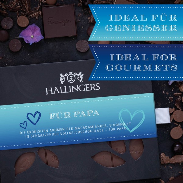 Vatertagsgeschenk Vollmilch Edel-Schokolade mit Macadamia-Nougat, handgemacht für Papa Vater Opa (90g, Tafel-Karton). Exquisite Aromen der ?Königin der Nüsse? in einer zarten hellen Nougatcrème, eingehüllt in eine Tafel aus edel schmelzender Vollmilchscho
