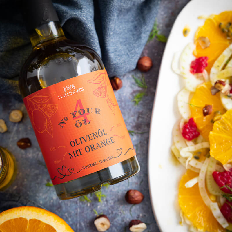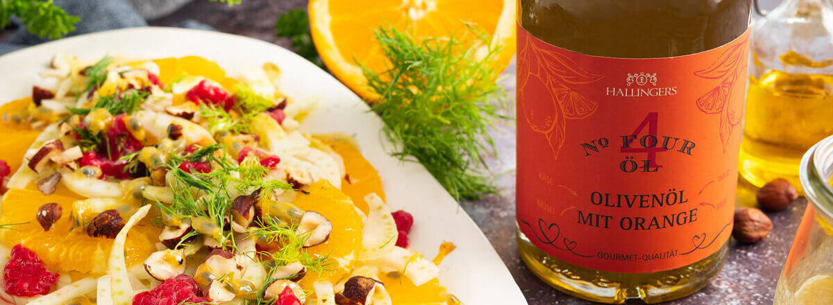 Für das Dressing die halbe Orange, den Senf und das Olivenöl mit Orange mit einem Püriergerät pürieren, sodass eine dickflüssige Emulsion entsteht. Das Dressing nun noch mit Hallingers Pyramidensalz und dem originellen Orangen-Pfeffer abschmecken.