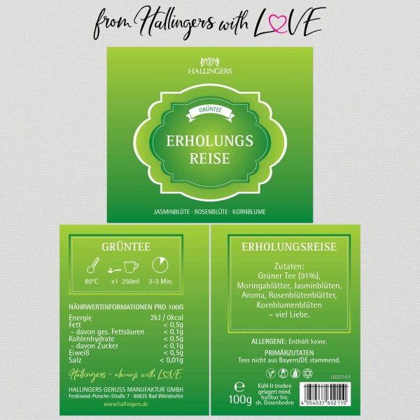 Zutaten: Grüner Tee (91%), Moringablätter, Jasminblüten, Aroma, Rosenblütenblätter, Kornblumenblüten — und viel Liebe.